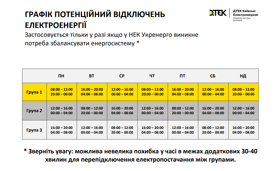 "Киевские электросети" публикуют график отключений по группам потребителей: