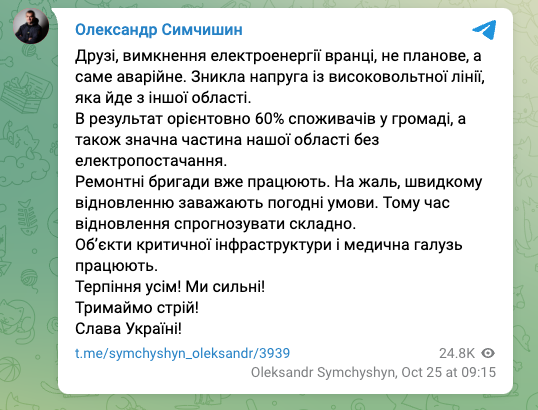 22 октября РФ нанесла очередной массированный удар по энергетике Украины во многих областях, в том числе Хмельницкой, где без света остались сразу почти 700 тысяч абонентов.