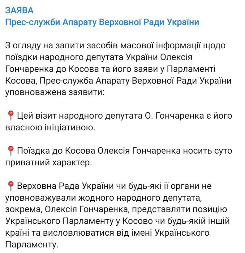 После того, как депутат от партии Порошенко 27 октября выступил в косовском "парламенте", аппарат Рады заявил, что это частная поездка Гончаренко, и официально его никто не уполномочивал.