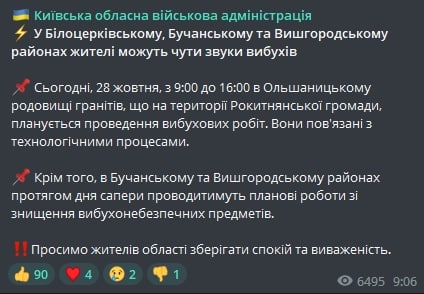09.20 В Бучанском и Вышгородском районах Киевской области жители могут сегодня слышать взрывы, сообщили в Киевской областной военной администрации.