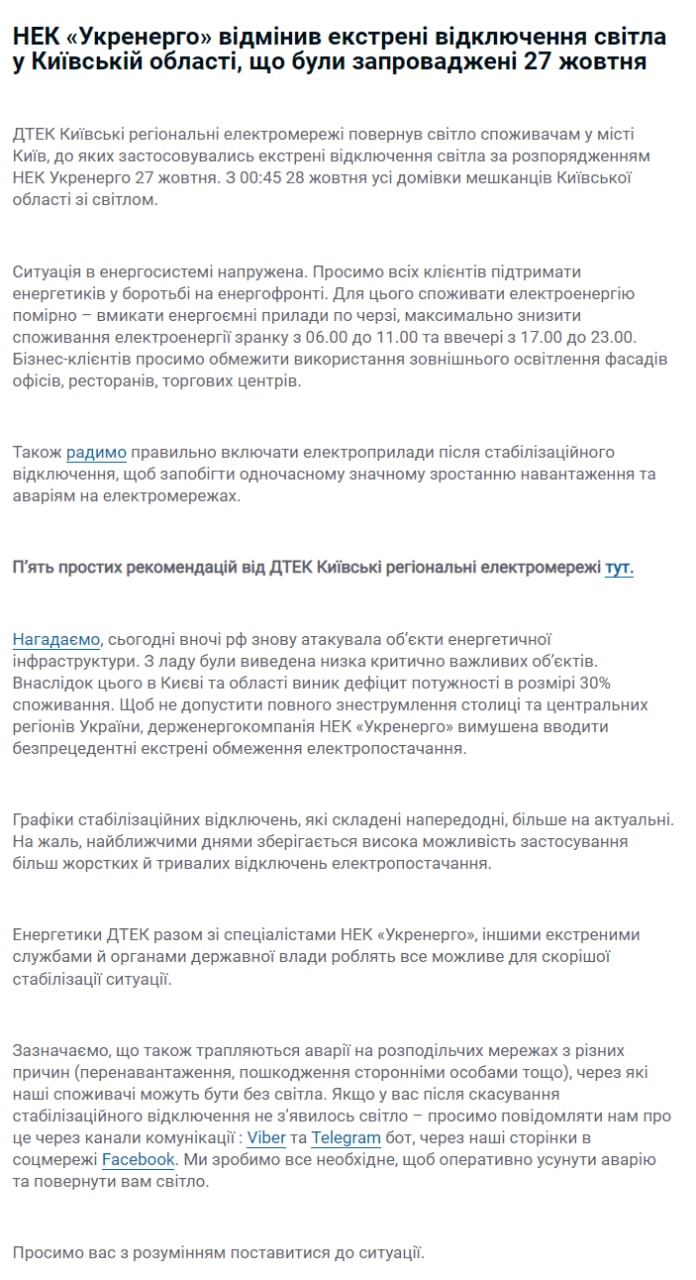 Причина - критическая нехватка электроснабжения из-за очередной атаки РФ на объекты критической инфраструктуры.