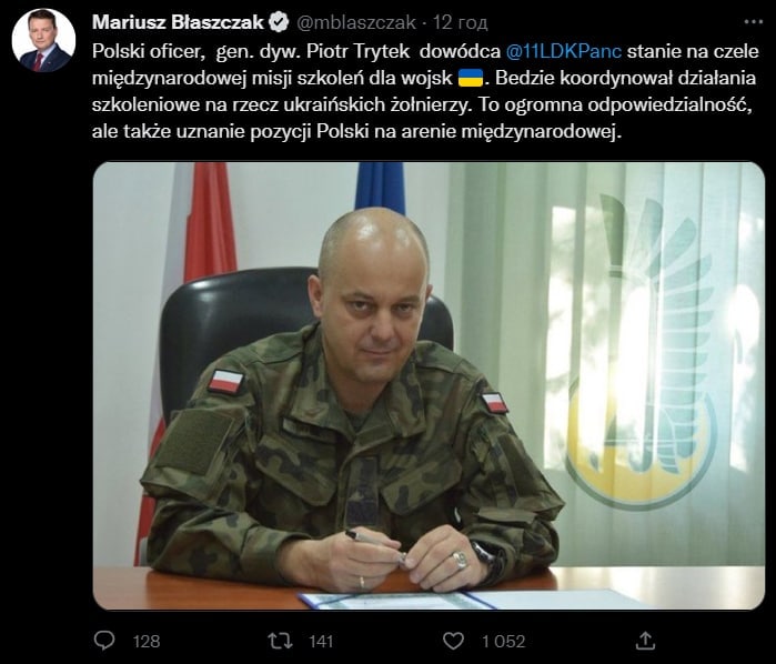 10.45 Командующим миссией Евросоюза по обучению украинских военнослужащих назначен польский генерал-майор Петр Тритек, сообщил министр обороны Польши Мариуш Блащак
