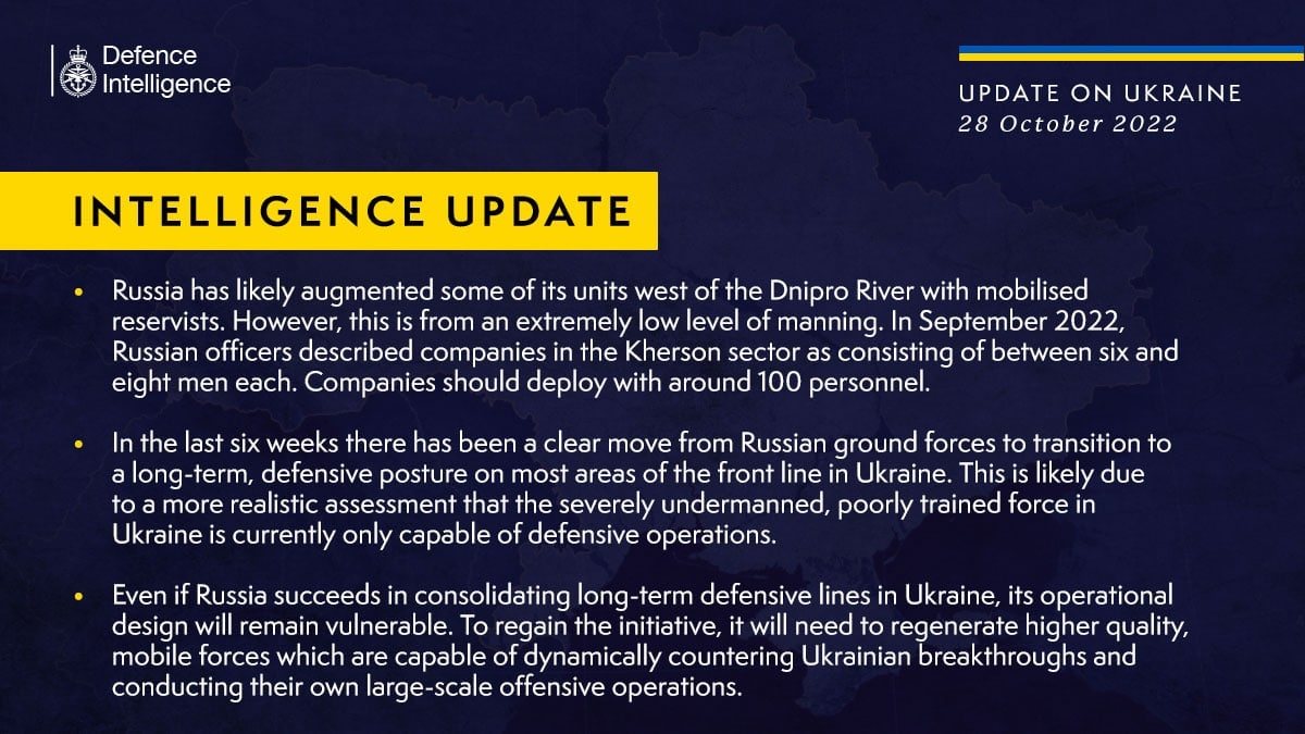 11.10 Россия переходит к долгосрочной оборонительной позиции на большинстве участков фронта, сообщает разведка Великобритании.