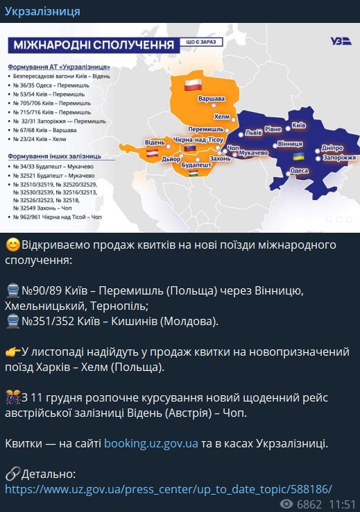 Также в ноябре поступят в продажу билеты на новый поезд Харьков – Хелм (Польша), а с 11 декабря начнет курсирование новый ежедневный рейс австрийской железной дороги Вена (Австрия) – Чоп.