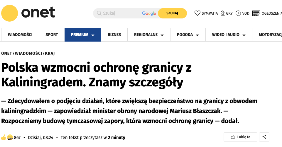 "Я принял решение о строительстве временного заграждения на границе с Калининградской областью. Мы хотим, чтобы граница была плотной. Мы используем опыт прошлого года", – сказал Блащак на пресс-конференции.