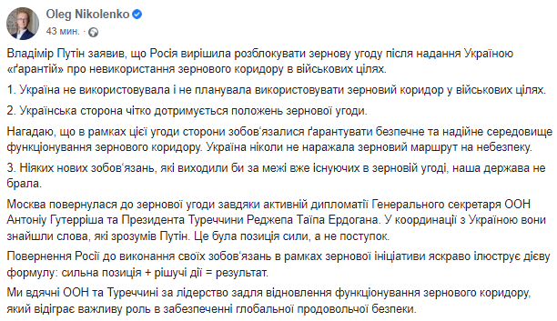 "Москва вернулась к зерновому соглашению благодаря активной дипломатии Генерального секретаря ООН Антониу Гутерриша и Президента Турции Реджепа Тайипа Эрдогана. В координации с Украиной они нашли слова, которые понял Путин. Это была позиция силы, а не уступки. Возвращение России к выполнению своих обязательств в рамках зерновой инициативы ярко иллюстрирует действенную формулу: сильная позиция + решительные действия = результат. Мы благодарны ООН и Турции за лидерство для возобновления функционирования зернового коридора, играющего важную роль в обеспечении глобальной продовольственной безопасности", - заявил Николенко.
