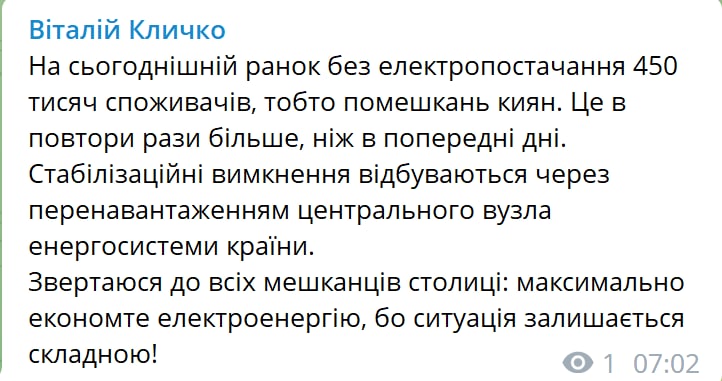 Причина - перегрузка энергосистемы по всей стране. В связи с чем Кличко призвал усилить экономию.