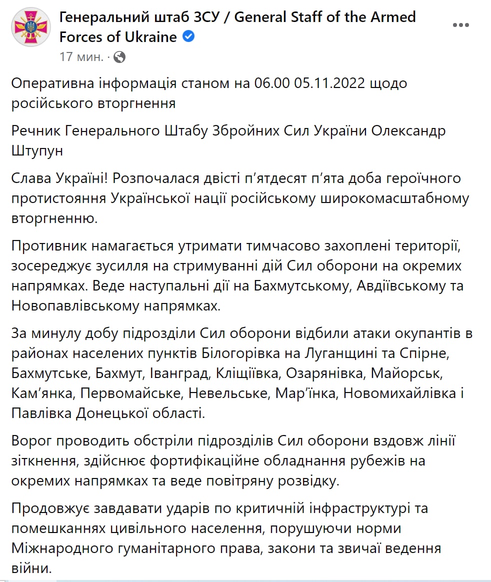 В Генштабе ВСУ опубликовали оперативную сводку с фронта по состоянию на 06:00 5 ноября. Сообщается, что российские войска наступают под Бахмутом, Авдеевкой и Новопавловкой.