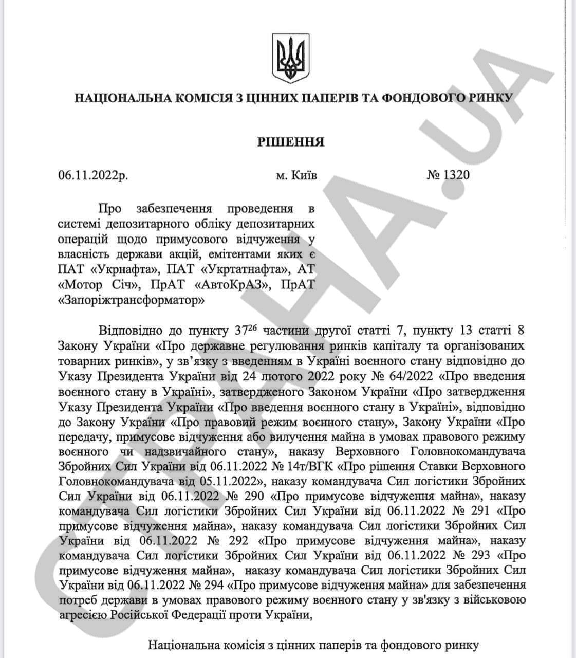 В документе указано, что акции переходят в собственность государства, на основании решения Ставки верховного главнокомандующего и ряда законов о режиме военного положения, в частности, принятый в сентябре закон "О передаче, принудительном отчуждении или изъятии имущества в условиях правового режима военного или чрезвычайного положения".