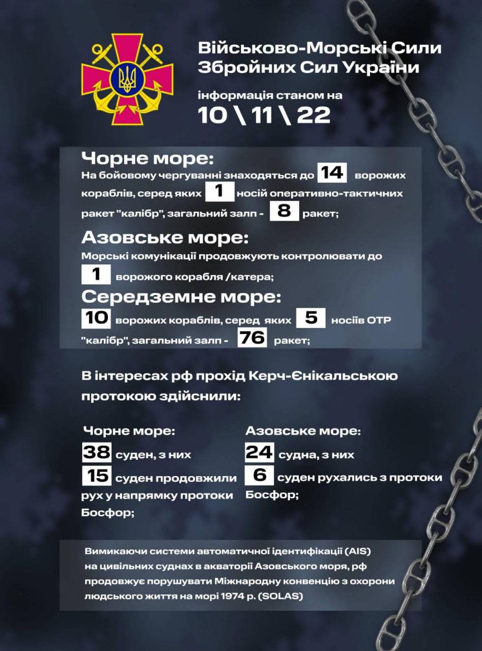 В Средиземном море 10 вражеских кораблей РФ, среди которых 5 носителей ОТР "Калибр", общим залпом 76 ракет.