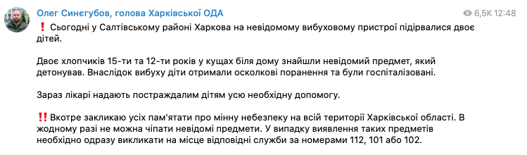 В Салтовском районе Харькова двое детей подорвались на неизвестном взрывном устройстве, которое нашли в кустах возле дома. В результате двое мальчиков 15 и 12 лет получили осколочные ранения и были госпитализированы.