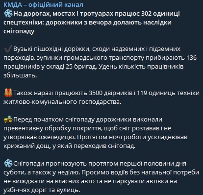 Перед началом снегопада дорожники выполнили превентивную обработку покрытия, чтобы снег таял и не образовывал гололедицу. Вместе с тем, минувшей ночью работы усугублял ледяной дождь, в который переходил снегопад, добавили в КГГА.