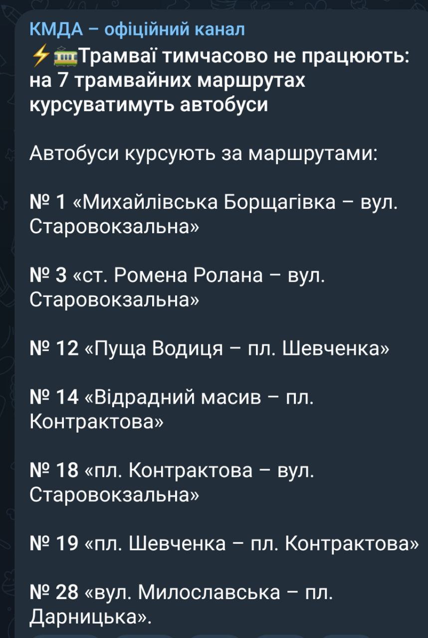 Из-за проблем с электричеством сегодня в Киеве не будут ходить трамваи. КГГА опубликовала список маршрутов, где их заменят автобусы:
