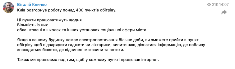В Киеве развернули более 400 пунктов обогрева, где можно подзарядиться. Скоро в них запустят интернет. Карта