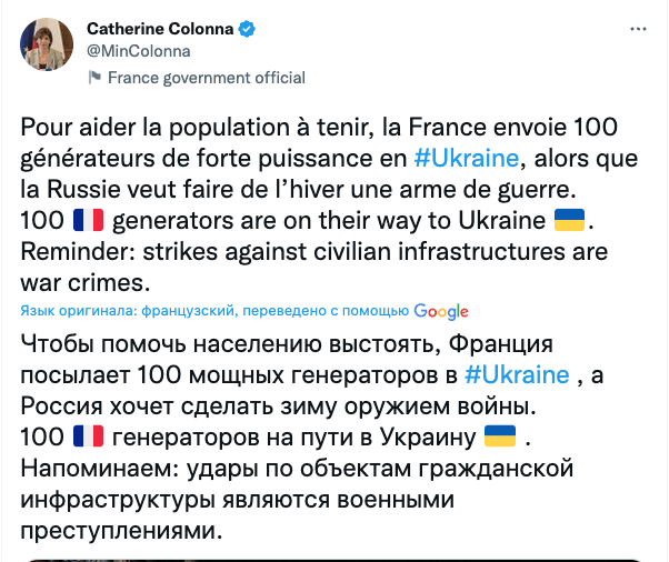"100 французских генераторов уже по пути в Украину. Напоминаем, что удары по гражданской инфраструктуре являются военными преступлениями", - заявила Колонна.