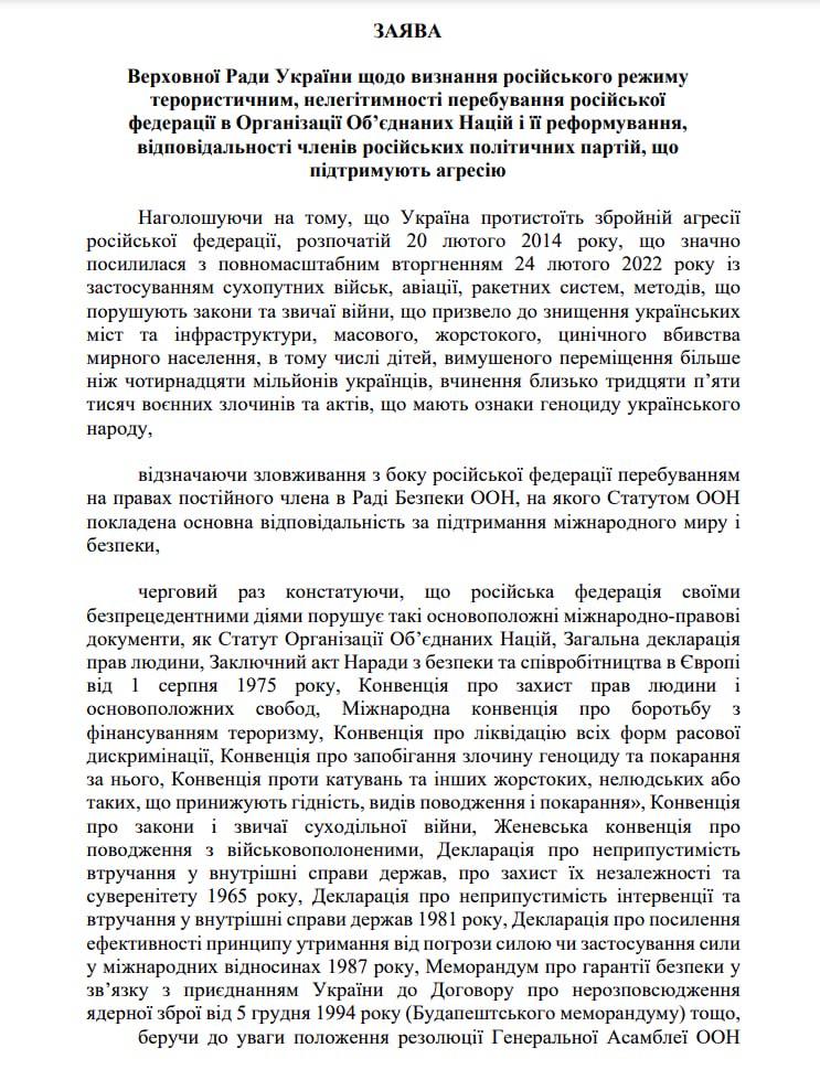 Спикер Верховной Рады Руслан Стефанчук и ряд других депутатов подготовили проект постановления об обращении украинского парламента ко всем правительствам и парламентам мира, чтобы признать РФ государством-спонсором терроризма.