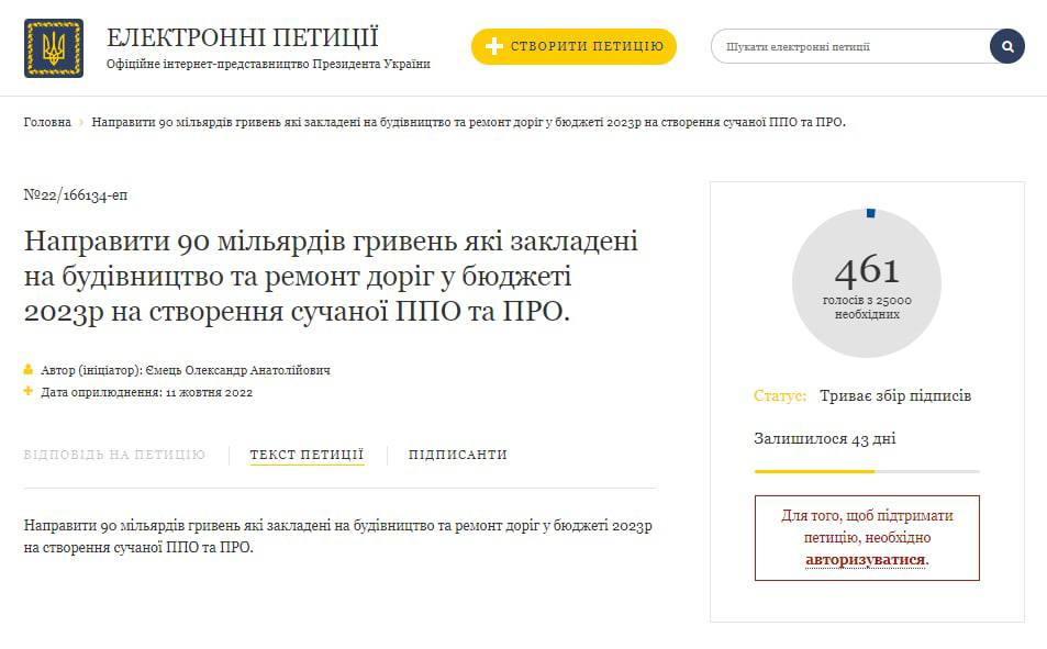 На сайте президента Украины Владимира Зеленского появилась петиция, через которую украинцы просят потратить деньги, заложенные в госбюджет-2023 на ремонт дорог, на создание современной системы ПВО-ПРО.