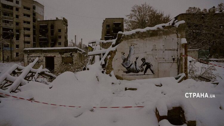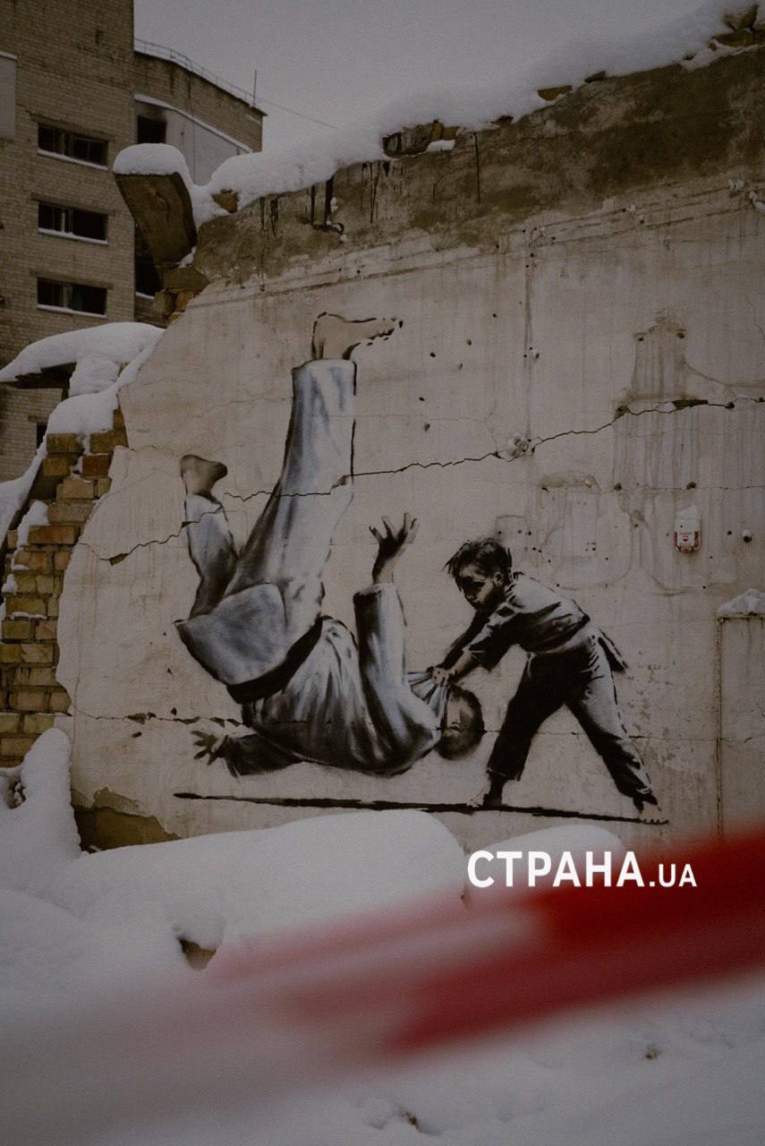 "Страна" побывала в Бородянке, где Бэнкси нарисовал два граффити, гимнастку на одном из разрушенных домов, и дзюдоистов, где мальчик в кимоно бросает на пол крупного соперника.
