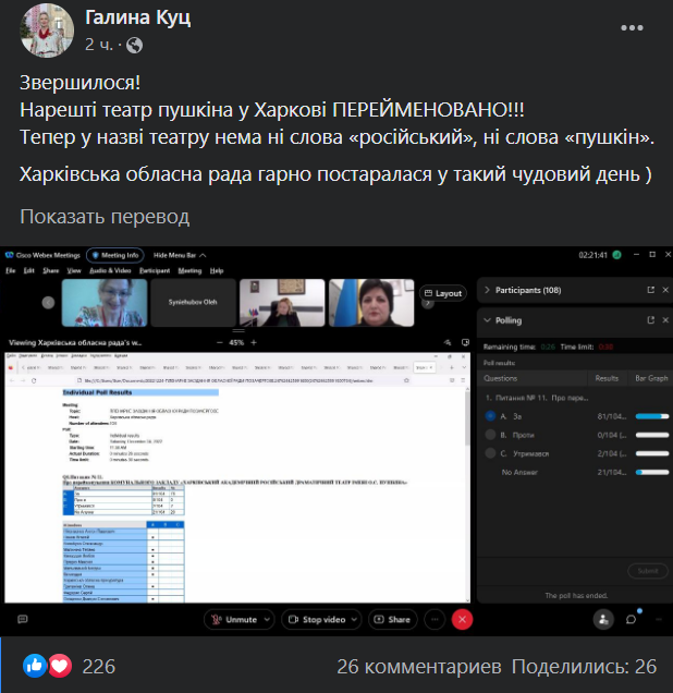 За то, чтобы убрать из названия слова "русский" и Пушкин", на сессии проголосовал 81 депутат, еще двое - воздержались. Всего в областном совете - 104 депутата, то есть, 21 человек своего мнения по этому поводу не высказал.
