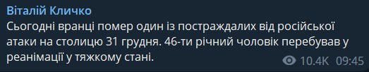 09.55 В Киеве утром умер один из пострадавших во время атаки на столицу 31 декабря, сообщил мэр Киева Виталий Кличко.