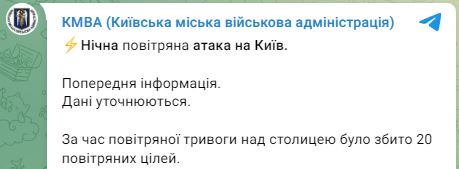 07.00 По предварительной информации во время атаки беспилотниками в Киеве было уничтожено 20 воздушных целей.