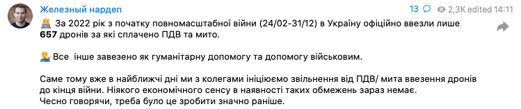 "Все остальное завезено как гуманитарная помощь и помощь военным. Именно поэтому уже в ближайшие дни мы с коллегами инициируем освобождение от НДС/пошлины ввоза дронов до конца войны. Никакого экономического смысла от наличия таких ограничений сейчас нет. Честно говоря, нужно было это сделать гораздо раньше", - пишет Железняк.