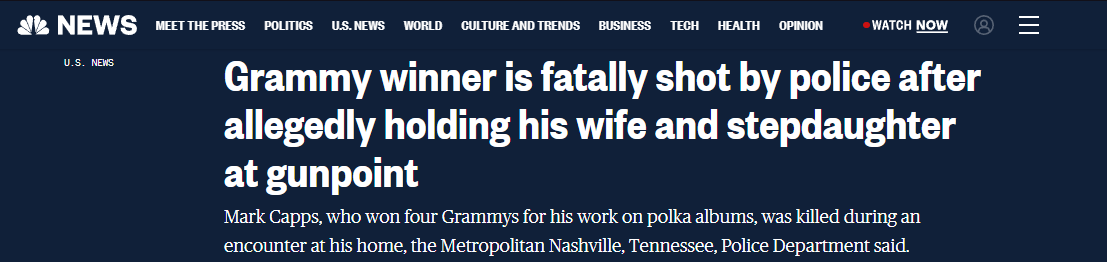 В Нэшвилле 54-летнего продюсера, звукорежиссера и лауреата премии "Грэмми" Марка Кэппса, обвиняемого в угрозах своей жене и падчерице под дулом пистолета, застрелили сотрудники полиции.