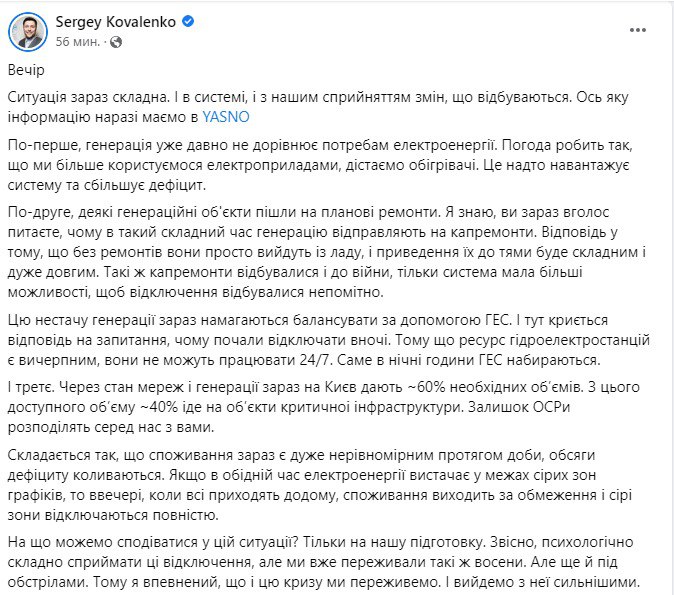 "Потребление сейчас очень неравномерно в течение суток, объемы дефицита колеблются. Если в обеденное время электроэнергии хватает в пределах серых зон графиков, то вечером, когда все приходят домой, потребление выходит за ограничения и серые зоны полностью отключаются", – написал Коваленко.