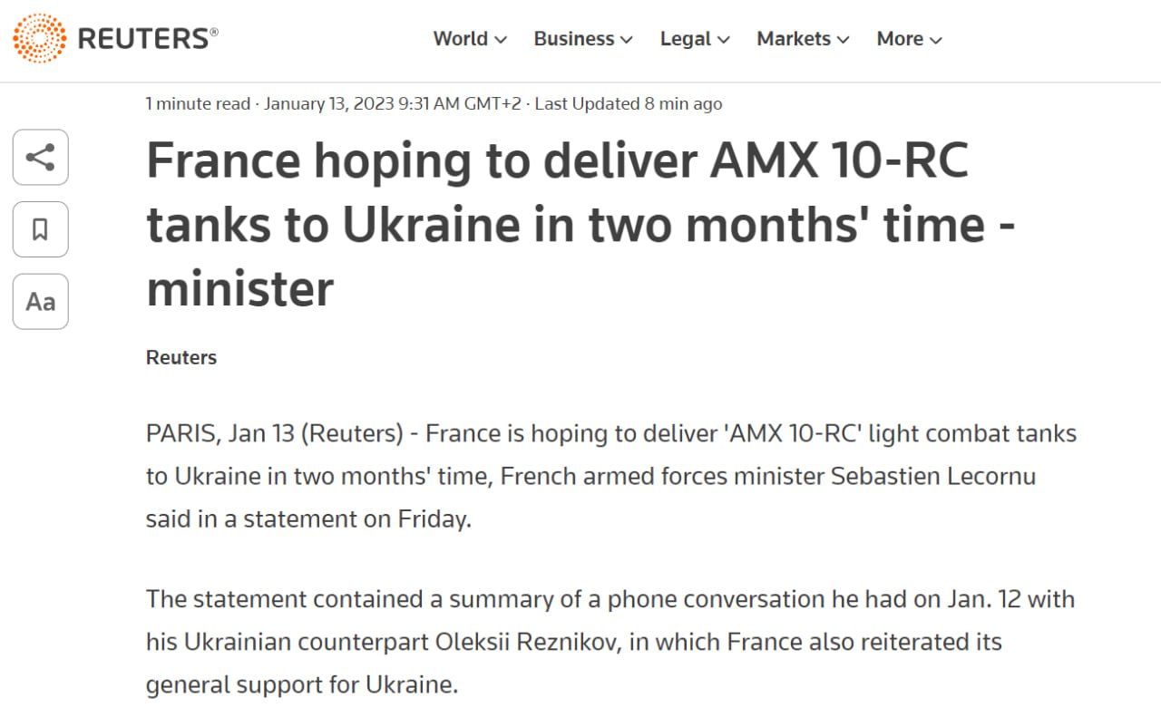 Франция надеется поставить в Украину танки AMX 10-RC в течение двух месяцев.