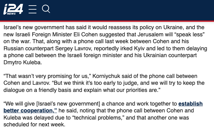 Издание же связывает перенос телефонного разговора с "раздражением Киева" на фоне того, что Израиль не поставляет Украине военную помощь, а новый министр иностранных дел Эли Коэн заявил, что "Израиль будет меньше говорить о войне" и провел переговоры с российским министром Сергеем Лавровым.