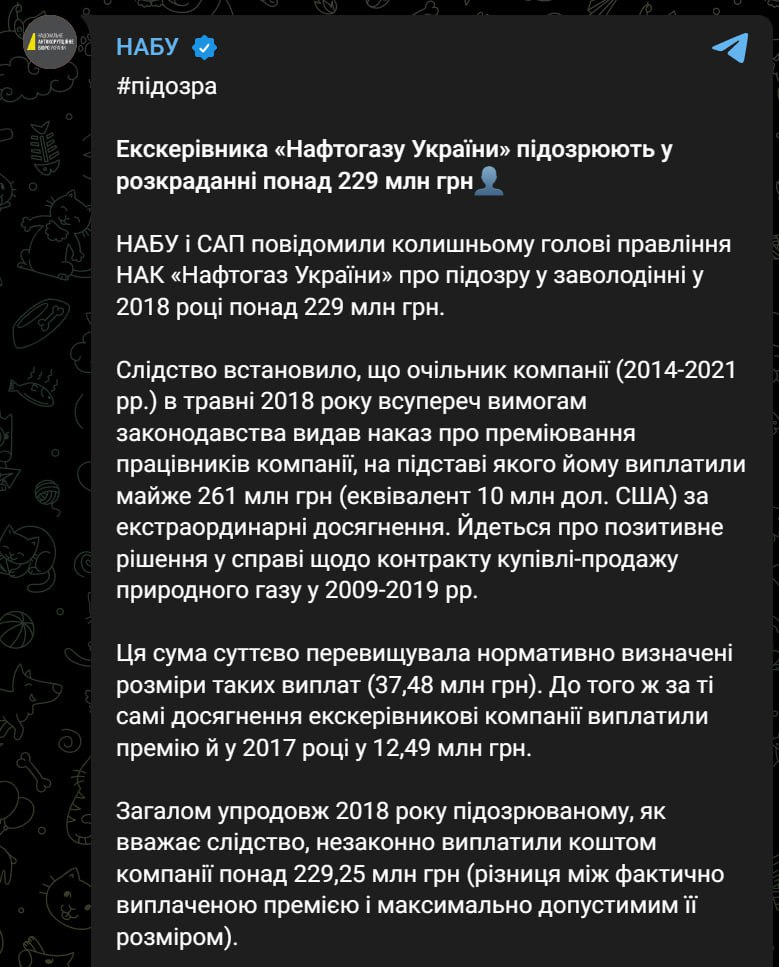 НАБУ объявило о подозрении бывшему главе правления "Нафтогаза", который руководил компанией с 2014 по 2021 годы. То есть - Андрею Коболеву. Его подозревают в хищении на 229 миллионов.