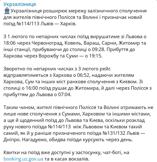 "Укрзализныця" объявила о запуске нового поезда Львов – Харьков (№114/11), который расширяет сеть ж/д сообщения для жителей северного Полесья и Волыни.
