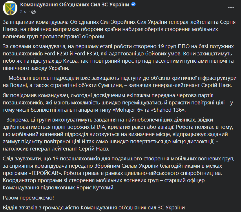 "На первом этапе работы создано 19 групп ПВО на базе мощных внедорожников Ford F250 и Ford F350, адаптированных к боевым условиям. Они будут защищать небо как на подступах к Киеву, так и воздушное пространство над населенными пунктами севера и северо-запада Украины", - отметил Наев.
