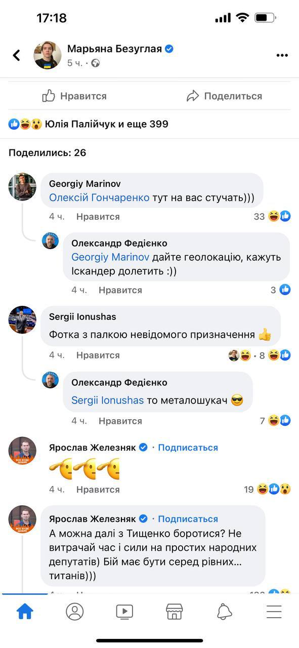 Кроме этого, в комментарии под пост Безуглой пришел глава комитета по вопросам правоохранительной деятельности депутат из "Слуги народа" Сергей Ионушас, который высказал свое мнение о предназначении селфи-палки в руках Гончаренко.