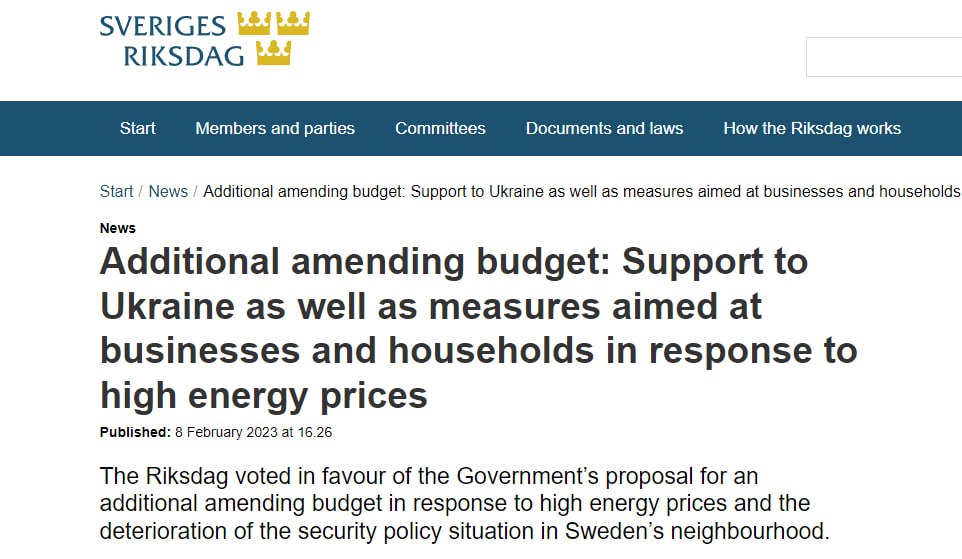 Парламент Швеции одобрил пакет военной помощи Украине на более чем $400 млн.