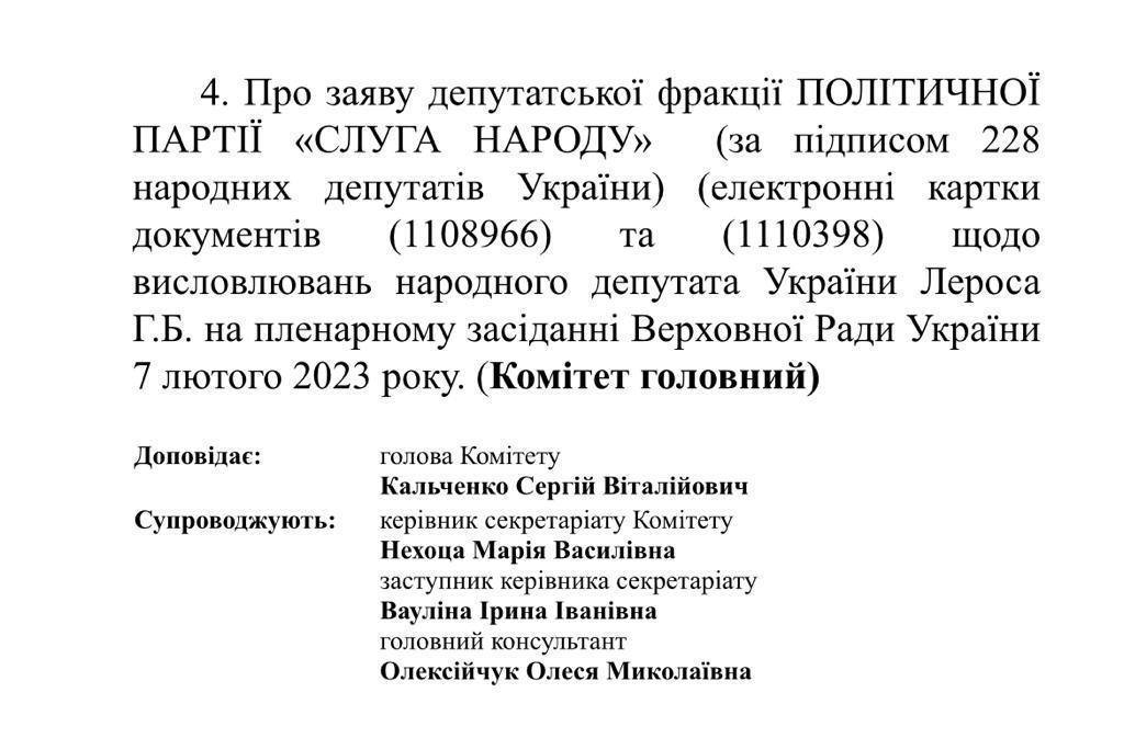 Напомним, речь идет о пленарном заседании 7 февраля, когда во время рассмотрения вопроса о назначении главой СБУ Василия Малюка Гео Лерос "допустил оскорбительные высказывания в адрес СБУ и главы Офиса президента Украины Андрея Ермака", говорилось в обращении, текст которого подписали 228 депутатов.