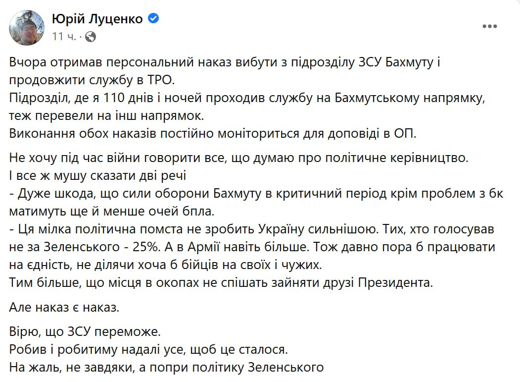"Вчера получил личный приказ покинуть подразделение ВСУ в Бахмуте и продолжить службу в ТРО. Подразделение, где я служил на направлении Бахмута в течение 110 дней и ночей, также перевели на другое направление. Выполнение обоих приказов постоянно контролируется в OП", - заявляет Луценко.