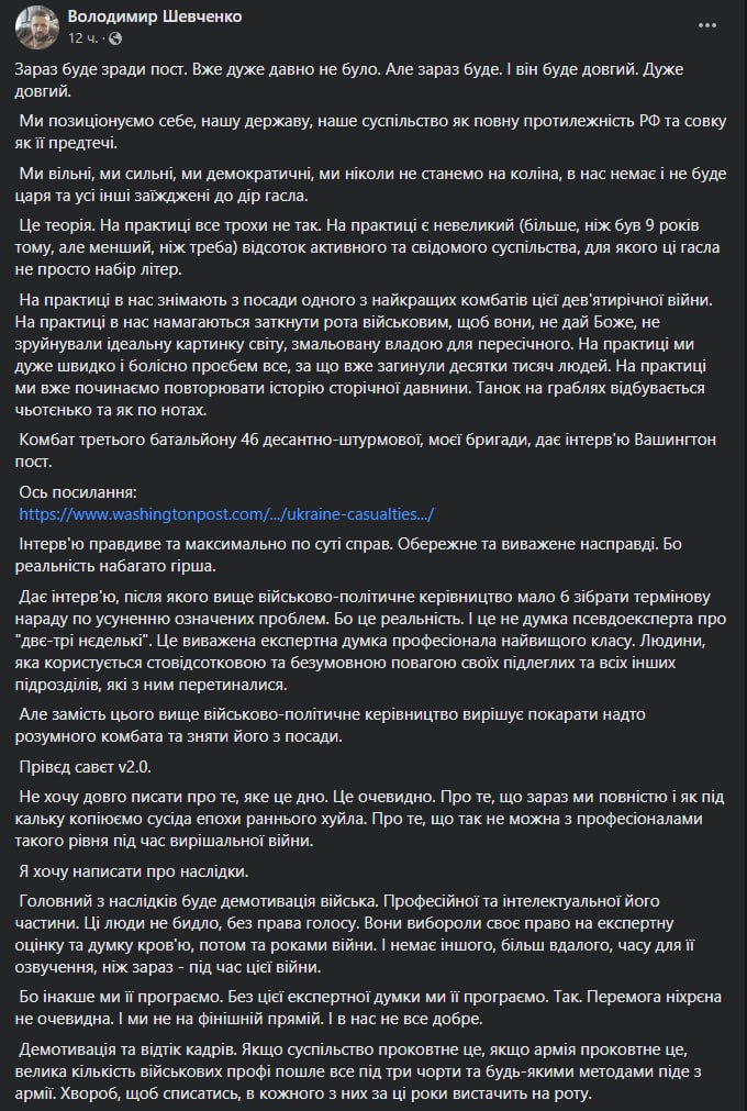 Шевченко пишет, что интервью "правдивое и максимально по существу дел" и на самом деле, осторожное и взвешенное, "потому что реальность гораздо хуже", пишет он.