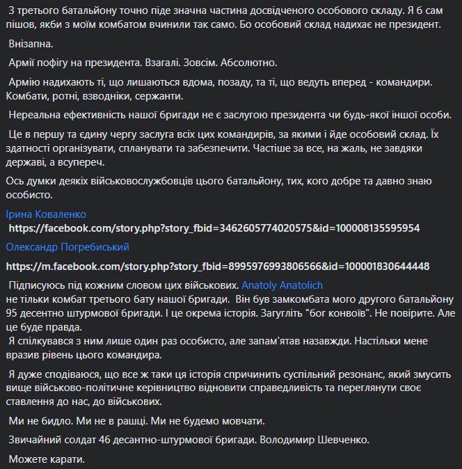 Солдат 46-й десантно-штурмовой бригады Владимир Шевченко вступился за комбата Купола, которого понизили в должности за интервью Washington Post.