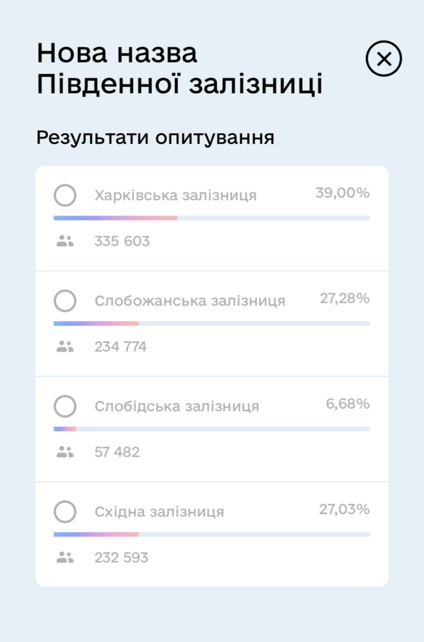 В опросе приняли участие более 860 400 пользователей. За вариант "Харьковская железная дорога" отдали 335 600 голосов.