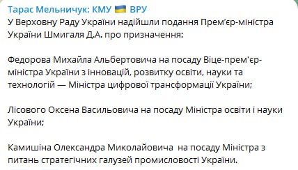 В Верховную Раду официально поступили представления о назначении Оксена Лисового главой Минобразования, Александра Камышина – министром стратегических отраслей промышленности, Михаила Федорова – вице-премьером по вопросу инноваций.