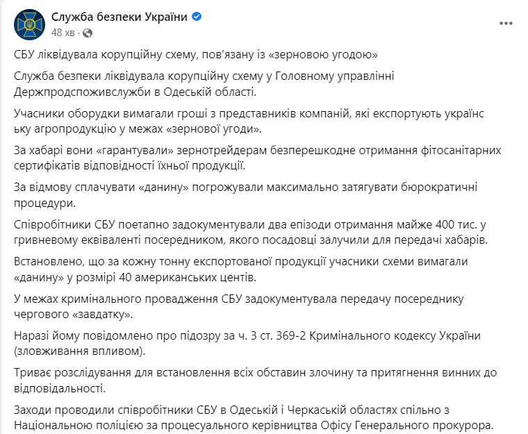 Служба безопасности Украины (СБУ) ликвидировала коррупционную схему, связанную с "зерновой сделкой". Схема работала в управлении Госпродпотребслужбы в Одесской области.