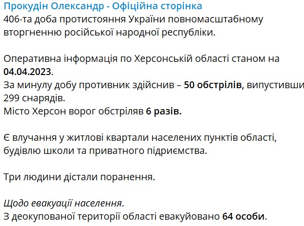 Об этом сообщает глава Херсонской ОВА Александр Прокудин в своем телеграм-канале.