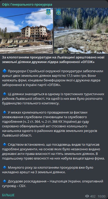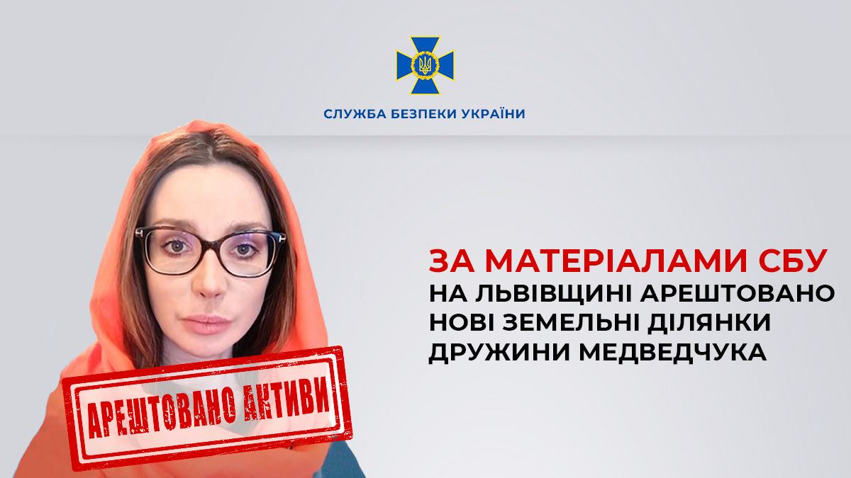Во Львовской области арестовали участки жены Виктора Медведчука Оксаны Марченко. Стоимость двух арестованных участков 17,5 млн грн.