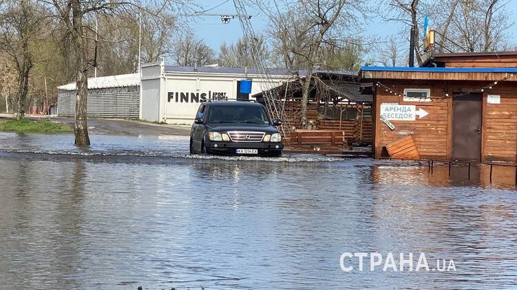 На Трухановом острове в Киеве затопило парк "Муромец". Предприниматели на джипах, где возможно проехать автомобилем, пытаются вывезти уцелевшие вещи.