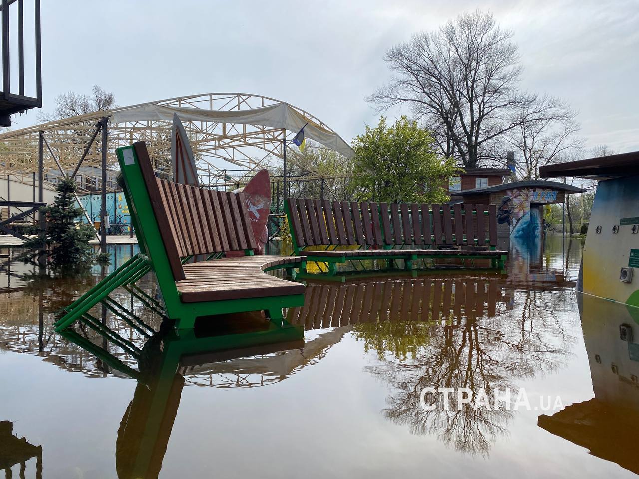 Также в сети появилось видео затопленного парка развлечений на Трухановом острове в Киеве, где киевляне передвигаются на плотах.