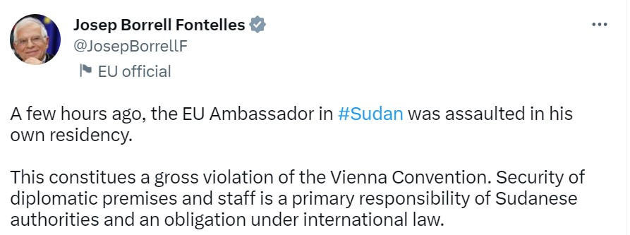 "Безопасность дипломатических помещений и персонала является главной обязанностью суданских властей и обязательством по международному праву", - написал Боррель.