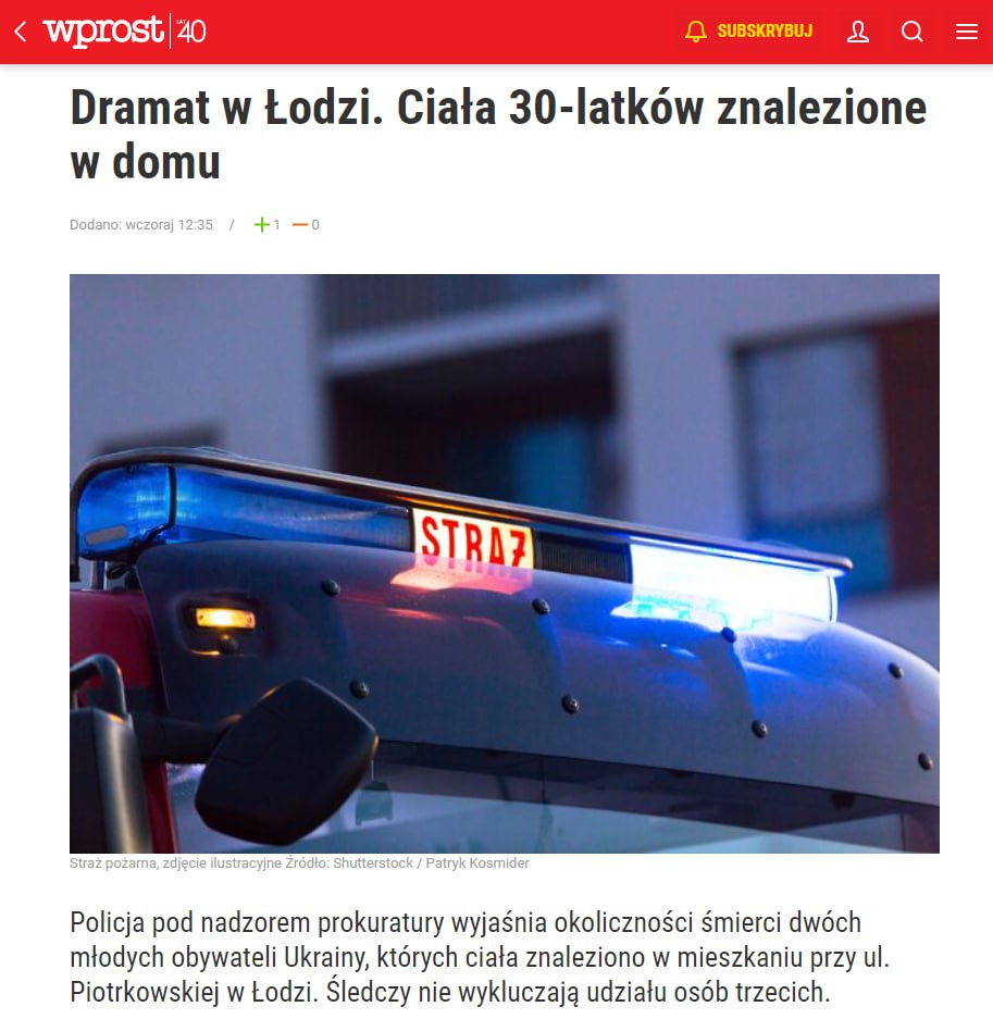 В Польше обнаружили мертвыми двух украинцев - 36-летнего мужчину и 31-летнюю женщину. Их тела обнаружили в арендуемой квартире в городе Лодзи на улице Пётрковской.