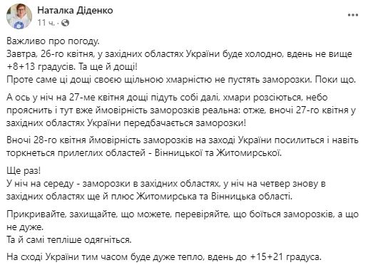 Синоптик Наталья Диденко пишет, что 26 апреля, в западных областях Украины будет холодно, днем не выше +8...+13, дожди. Однако именно эти дожди своей плотной облачностью не пустили заморозки сегодня ночью. Однако ночью 27 апреля, когда облака рассеются, вероятность заморозков реальна в западных областях Украины, а ночью 28 апреля и в Винницкой и Житомирской области.