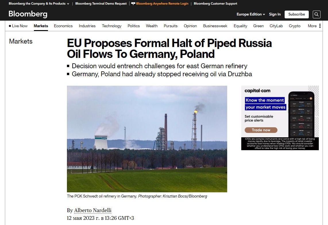 ЕС предлагает остановить поставки российской нефти в Германию и Польшу по трубопроводу "Дружба" - Bloomberg